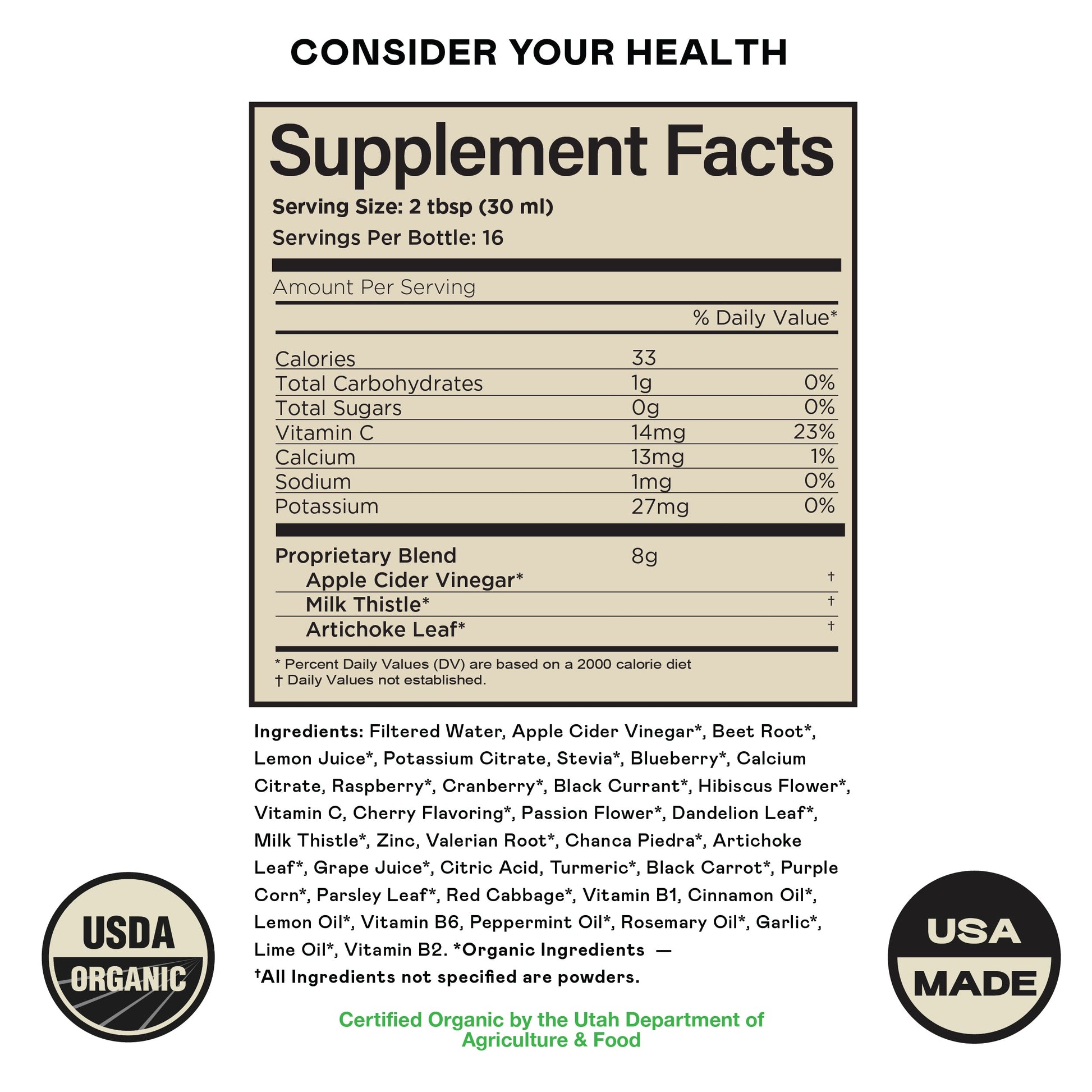 Filtered Water, Apple Cider Vinegar*, Beet Root*, Lemon Juice*, Potassium Citrate, Stevia*, Blueberry*, Calcium Citrate, Raspberry*, Cranberry*, Black Currant*, Hibiscus Flower*, Vitamin C, Cherry Flavoring*, Passion Flower*, Dandelion Leaf*, Milk Thistle*, Zinc, Valerian Root*, Chanca
